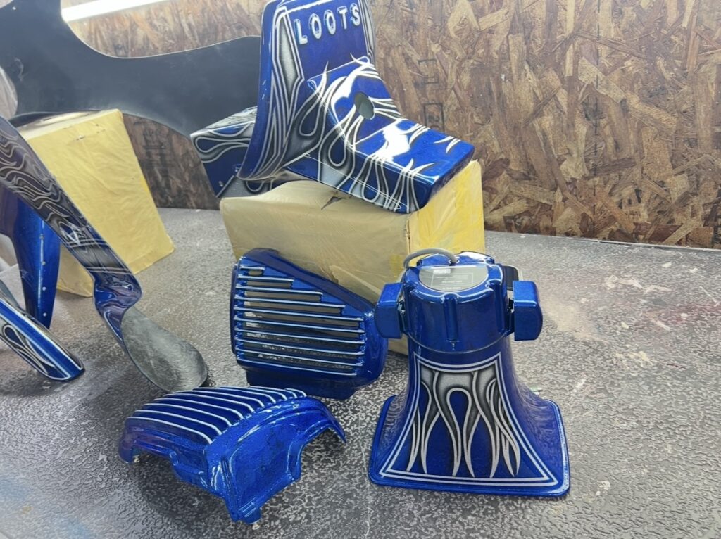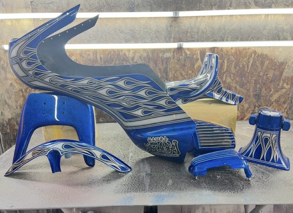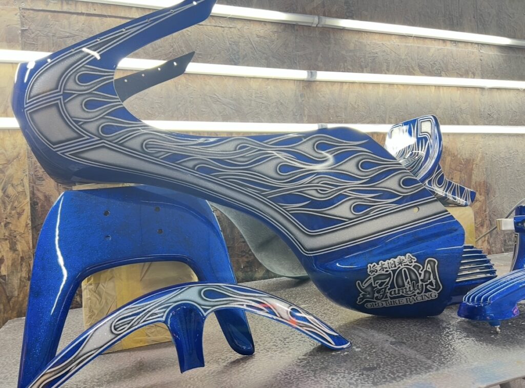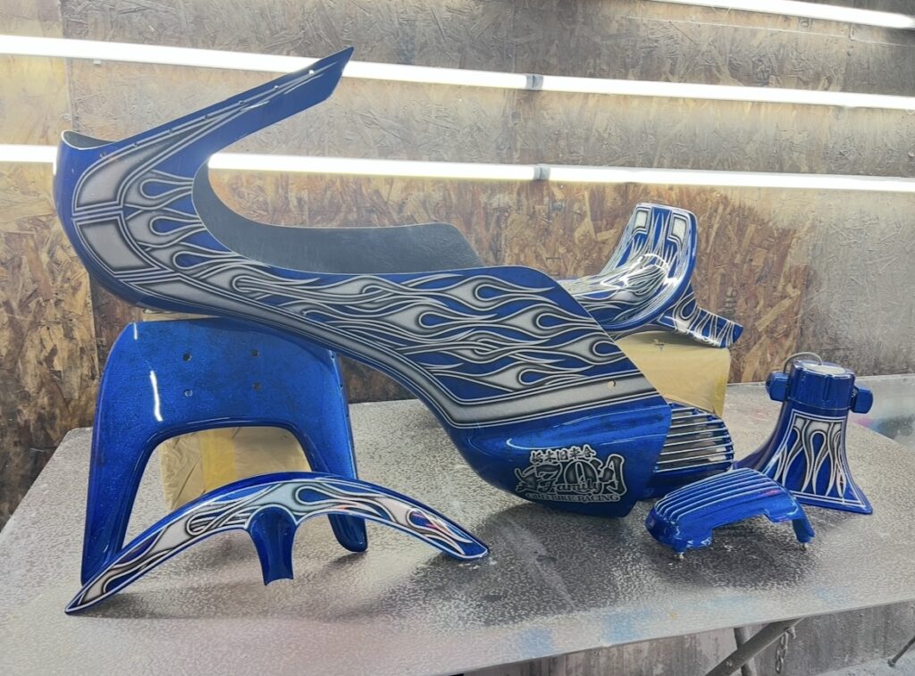 ラメ塗装、キャンディーカラー、ラップ塗装、ファイヤーパターンと非常に複雑な塗装でしたが、可能な限り合わせる事ができました^ ^